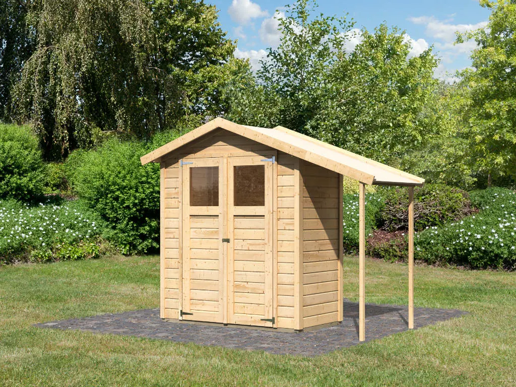 Das Gartenhaus wird inklusive imprägnierter Unterkonstruktion und Montagezubehör geliefert. Diese dient als Traggerüst, bietet ein solides Fundament und sorgt für die nötige Stabilität. Die Kesseldruckimprägnierung macht die Unterkonstruktionshölzer besonders beständig gegen Witterungseinflüsse, Moderfäule, Insekten, Schimmel und Pilze. Pflegeleicht und langlebig ist die Unterkonstruktion für alle Untergründe geeignet.