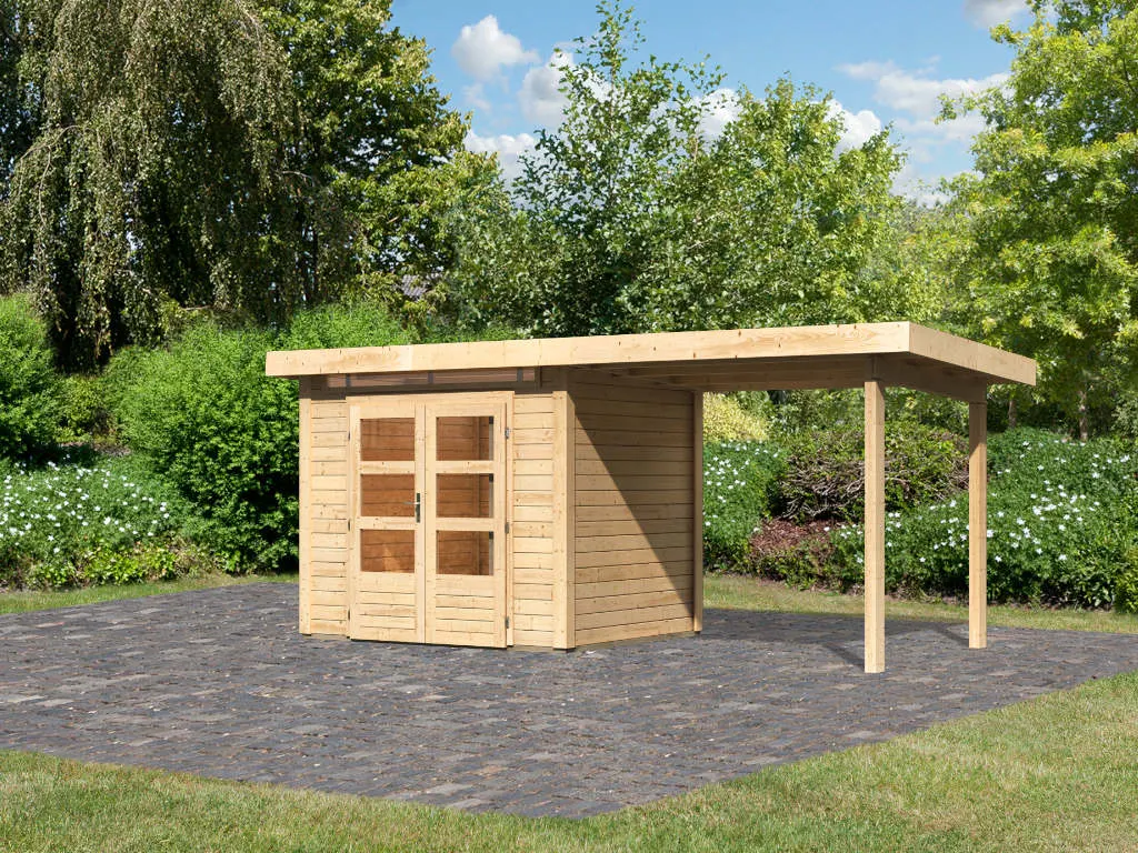 Für mehr Raum und vielfältige Nutzungsmöglichkeiten sorgt dieses Gartenhaus mit Anbaudach. Das großzügig geschnittene Anbaudach ermöglicht es, den Gartenalltag in vollen Zügen im Freien genießen zu können – geschützt vor Sonne, Wind und Regen. Der Platz unter dem Dach kann als gemütliche Terrasse zum Sitzen, Spielen oder Werkeln bei jedem Wetter genutzt werden. Alternativ eignet es sich auch als optimaler Unterstellplatz für zahlreiche Gartengeräte.