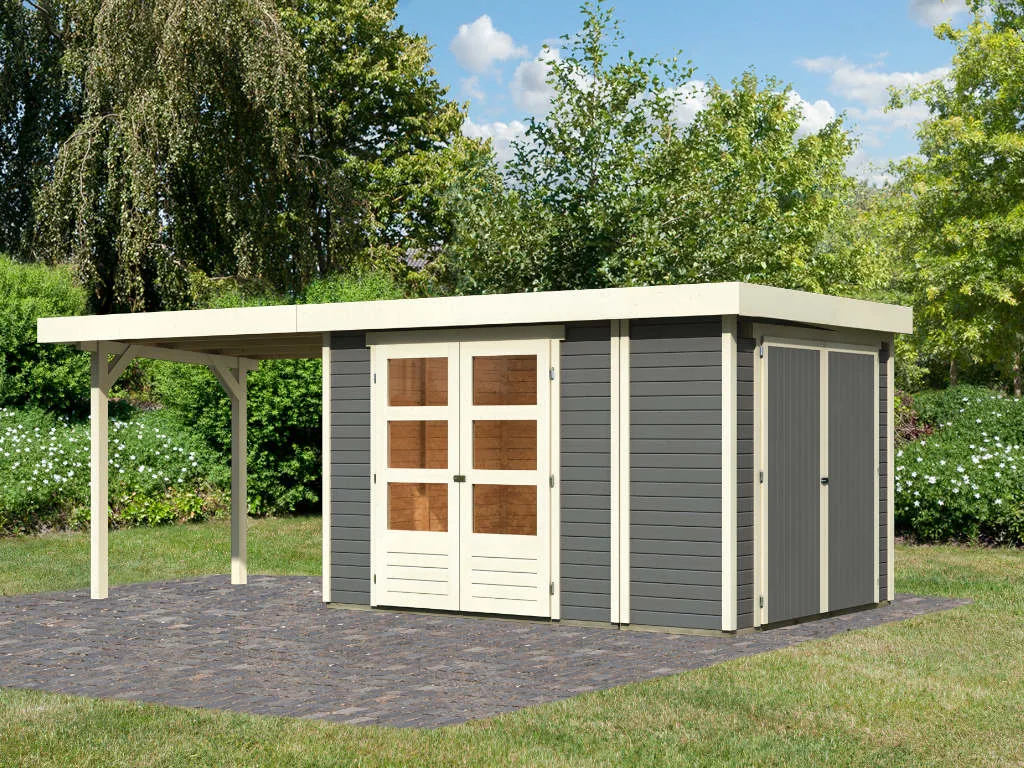 Für besonders viel Stauraum sorgt das Gartenhaus dank Anbauschrank, der mitgeliefert wird. Das Anbaudach und der zusätzliche Anbauschrank eignen sich optimal als Lagerplatz für Gartenmöbel und Gartenutensilien. Durch die Überdachung sind diese stets vor Regen und Sonne geschützt.