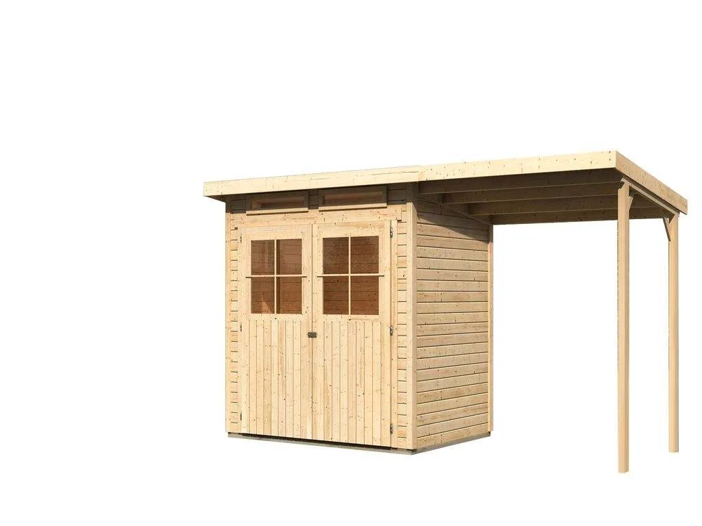 Für mehr Raum und vielfältige Nutzungsmöglichkeiten sorgt dieses Gartenhaus mit Anbaudach. Das großzügig geschnittene Anbaudach ermöglicht es, den Gartenalltag in vollen Zügen im Freien genießen zu können – geschützt vor Sonne, Wind und Regen. Der Platz unter dem Dach kann als gemütliche Terrasse zum Sitzen, Spielen oder Werkeln bei jedem Wetter genutzt werden. Alternativ eignet es sich auch als optimaler Unterstellplatz für zahlreiche Gartengeräte.