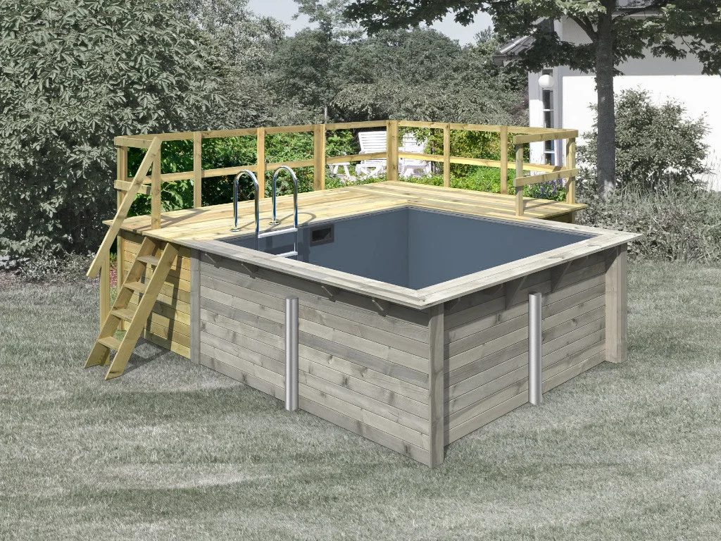 Eine Podesthöhe von 124 cm und Terrassenbreite von 142 cm sowie die Konstruktion über Eck bereiten einen perfekten Einstieg in den Pool und ausreichend Fläche für Liegestühle und eine große Topfpflanze für den grünen Look. Die Poolterrasse schließt optimal an den Pool an und lässt sich bequem mit einer Holzleiter erklimmen.