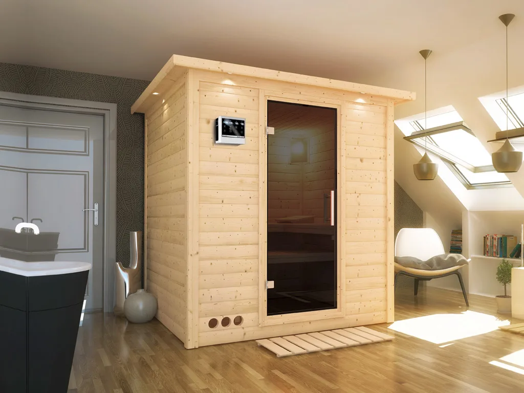 Diese Innensauna wird einschließlich Saunaofen mit externer Steuerung geliefert. Die Anbringung an der Außenseite der Sauna ermöglicht eine praktische Bedienung vor dem Saunieren und eine noch exaktere Einstellung der Temperatur. Weitere elektrische Geräte, wie eine Kabinenbeleuchtung, können ebenso an die externe Steuerung angeschlossen und mit dieser bedient werden.