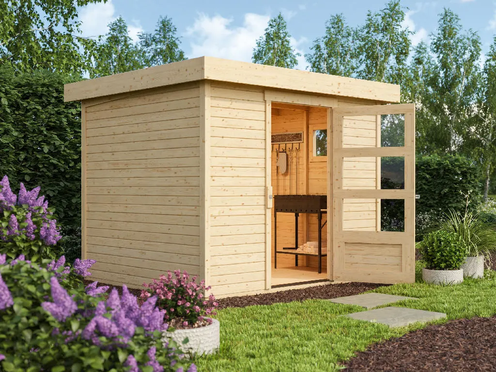 Das naturbelassene Holz sorgt für ein natürliches und zeitloses Aussehen. Außerdem ermöglicht dir das unbehandelte Holz, das Äußere des Gartenhauses ganz nach deinen eigenen Wünschen zu gestalten.