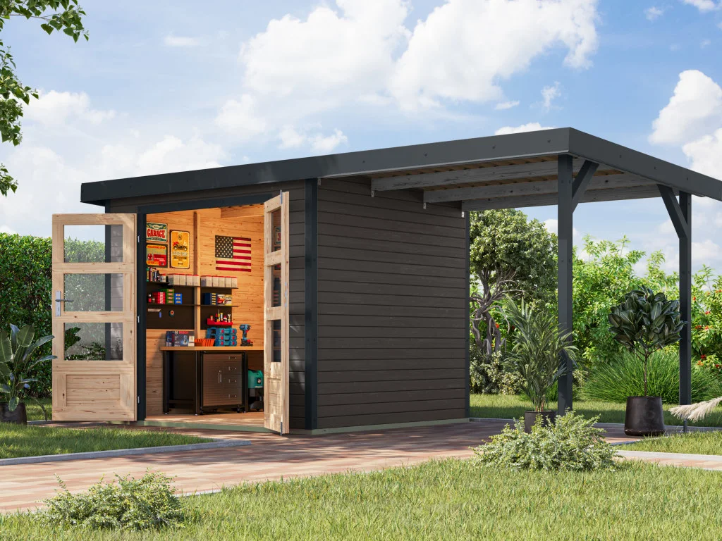 Im Vergleich zu herkömmlichen Holzgartenhäusern sind Hybridhäuser von Karibu erheblich wartungsärmer. Die Stahlecken schützen besonders gut vor Witterung und die Häuser überzeugen durch ihre moderne Optik.