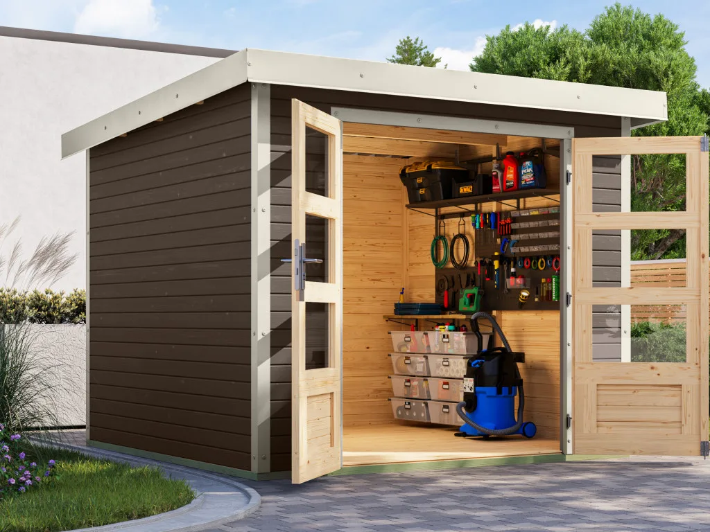 Im Vergleich zu herkömmlichen Holzgartenhäusern sind Hybridhäuser von Karibu erheblich wartungsärmer. Die Stahlecken schützen besonders gut vor Witterung und die Häuser überzeugen durch ihre moderne Optik.