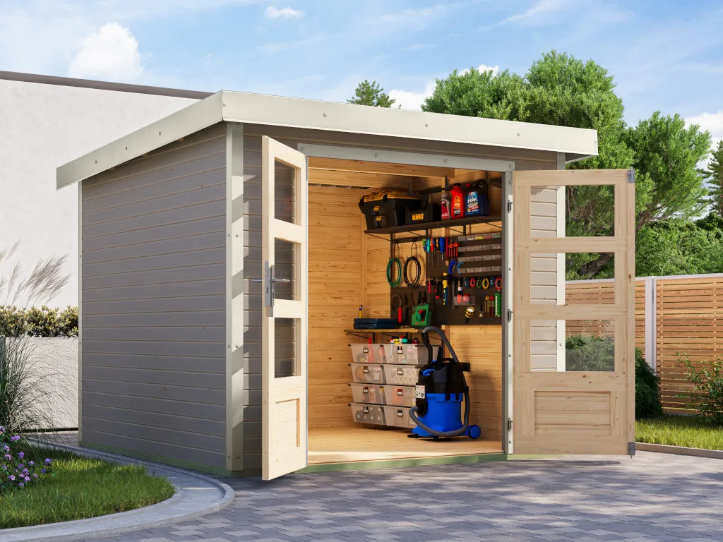 Ein modernes Pultdach verleiht deinem Gartenhaus eine stilvolle, elegante Optik. Durch nur eine geneigte Dachfläche ist die Nutzungsfläche im Inneren des Gartenhauses deutlich weniger eingeschränkt und der Verlust an Nutzraum gering. Zudem lässt die Neigungsseite des Pultdaches das Regenwasser gut abfließen und es ist die Montage von nur einer Regenrinne nötig. Des Weiteren sparst du dir Zeit und Geld bei der Montage des Daches. Durch die mitgelieferten Trapezbleche für das Dach muss kein weiteres Dachmaterial zur Eindeckung gekauft werden. Außerdem lassen sich die Platten schneller verlegen als Rauspund oder Spanplatten.