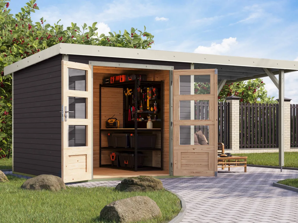 Im Vergleich zu herkömmlichen Holzgartenhäusern sind Hybridhäuser von Karibu erheblich wartungsärmer. Die Stahlecken schützen besonders gut vor Witterung und die Häuser überzeugen durch ihre moderne Optik.