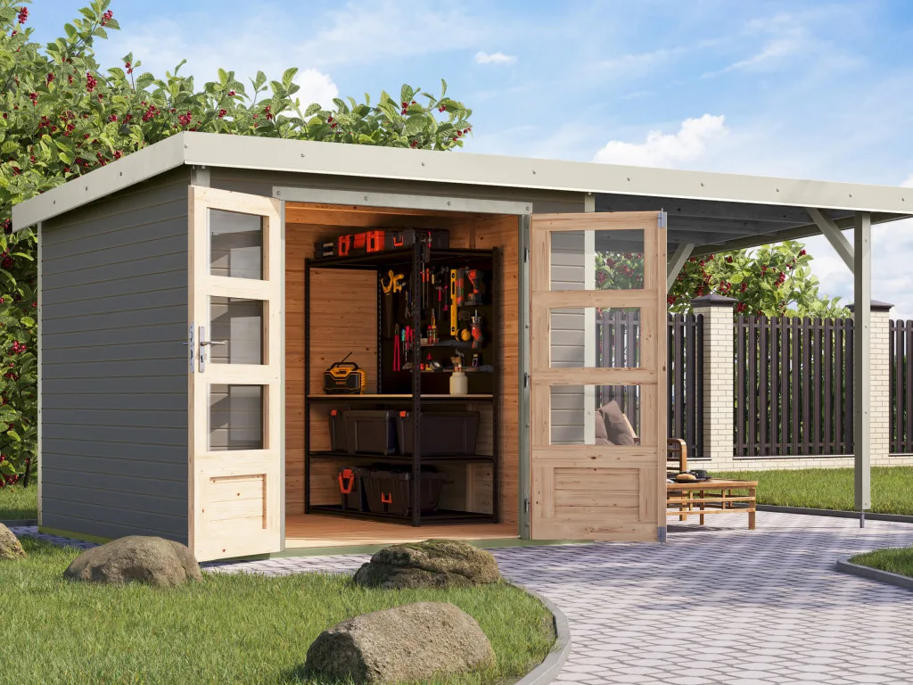 Im Vergleich zu herkömmlichen Holzgartenhäusern sind Hybridhäuser von Karibu erheblich wartungsärmer. Die Stahlecken schützen besonders gut vor Witterung und die Häuser überzeugen durch ihre moderne Optik.