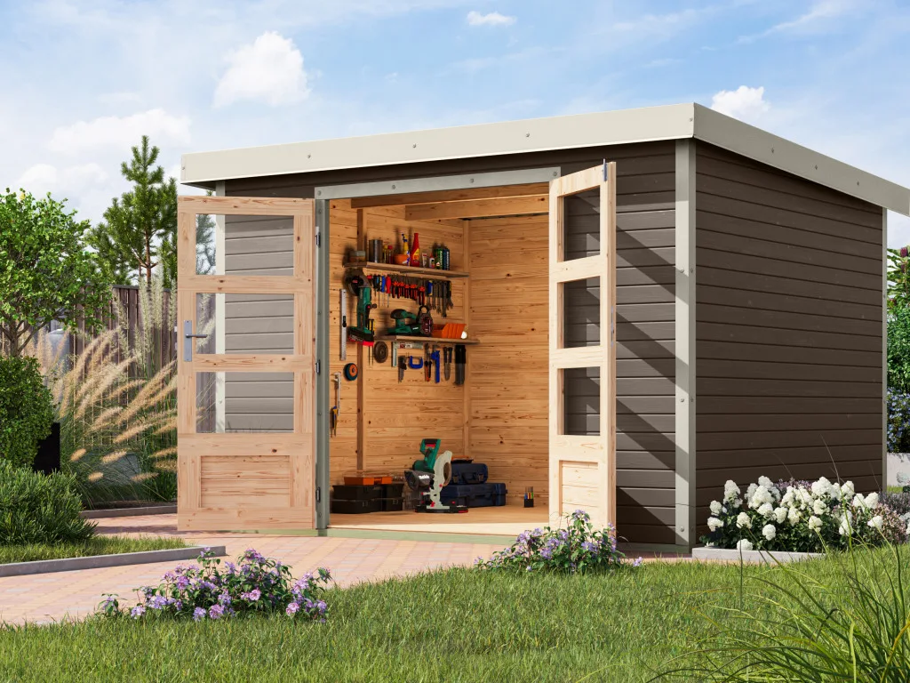 Ein modernes Pultdach verleiht deinem Gartenhaus eine stilvolle, elegante Optik. Durch nur eine geneigte Dachfläche ist die Nutzungsfläche im Inneren des Gartenhauses deutlich weniger eingeschränkt und der Verlust an Nutzraum gering. Zudem lässt die Neigungsseite des Pultdaches das Regenwasser gut abfließen und es ist die Montage von nur einer Regenrinne nötig. Des Weiteren sparst du dir Zeit und Geld bei der Montage des Daches. Durch die mitgelieferten Trapezbleche für das Dach muss kein weiteres Dachmaterial zur Eindeckung gekauft werden. Außerdem lassen sich die Platten schneller verlegen als Rauspund oder Spanplatten.