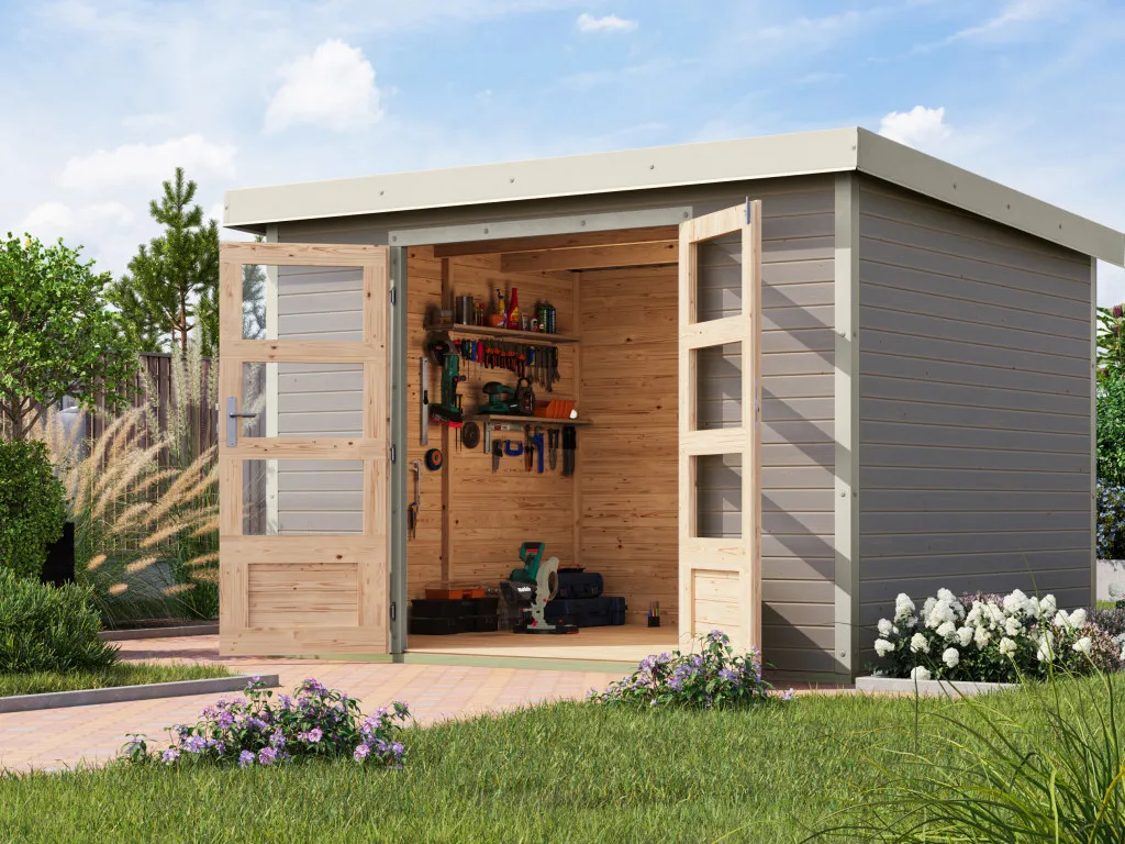 Ein modernes Pultdach verleiht deinem Gartenhaus eine stilvolle, elegante Optik. Durch nur eine geneigte Dachfläche ist die Nutzungsfläche im Inneren des Gartenhauses deutlich weniger eingeschränkt und der Verlust an Nutzraum gering. Zudem lässt die Neigungsseite des Pultdaches das Regenwasser gut abfließen und es ist die Montage von nur einer Regenrinne nötig. Des Weiteren sparst du dir Zeit und Geld bei der Montage des Daches. Durch die mitgelieferten Trapezbleche für das Dach muss kein weiteres Dachmaterial zur Eindeckung gekauft werden. Außerdem lassen sich die Platten schneller verlegen als Rauspund oder Spanplatten.