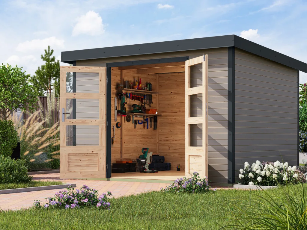 Ein modernes Pultdach verleiht deinem Gartenhaus eine stilvolle, elegante Optik. Durch nur eine geneigte Dachfläche ist die Nutzungsfläche im Inneren des Gartenhauses deutlich weniger eingeschränkt und der Verlust an Nutzraum gering. Zudem lässt die Neigungsseite des Pultdaches das Regenwasser gut abfließen und es ist die Montage von nur einer Regenrinne nötig. Des Weiteren sparst du dir Zeit und Geld bei der Montage des Daches. Durch die mitgelieferten Trapezbleche für das Dach muss kein weiteres Dachmaterial zur Eindeckung gekauft werden. Außerdem lassen sich die Platten schneller verlegen als Rauspund oder Spanplatten.