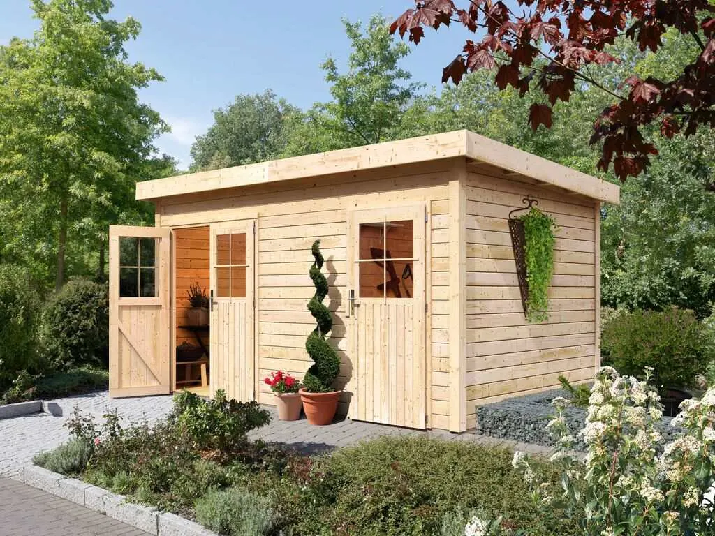 Dieses 2-Raum-Gartenhaus bietet viel Platz für eine multifunktionale Nutzung. Die durch eine Trennwand geschaffenen zwei Räume mit separaten Eingängen ermöglichen Dir, dieses Gartenhaus sowohl als gemütlichen Rückzugsort als auch als Stauraum für Gartengeräte zu nutzen.