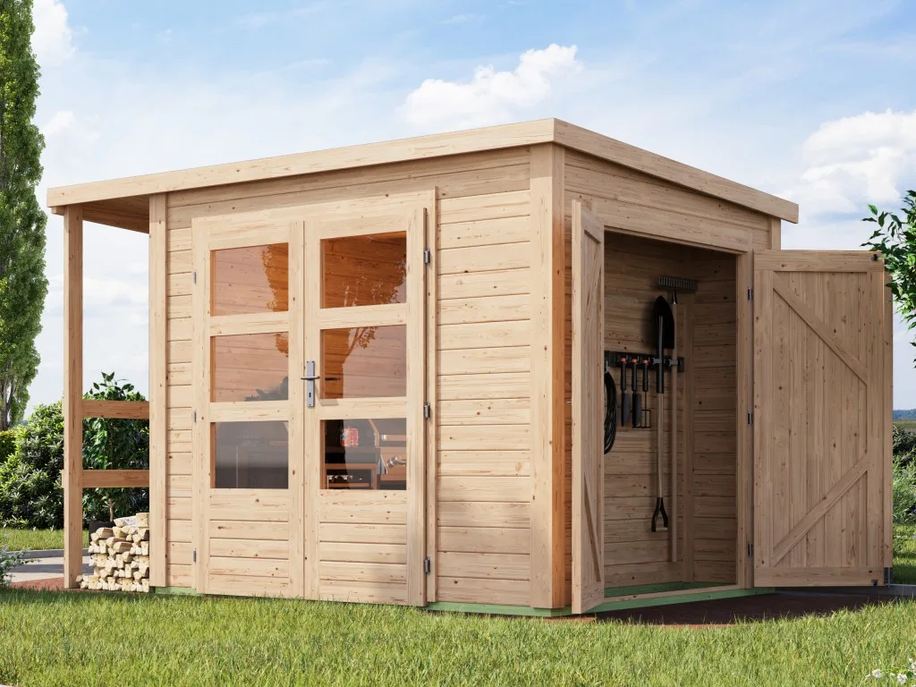 Für besonders viel Stauraum sorgt das Gartenhaus dank Anbauschrank, der mitgeliefert wird. Das Anbaudach und der zusätzliche Anbauschrank eignen sich optimal als Lagerplatz für Gartenmöbel und Gartenutensilien. Durch die Überdachung sind diese stets vor Regen und Sonne geschützt.