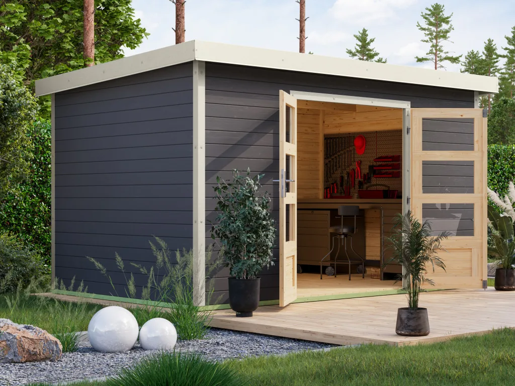 Im Vergleich zu herkömmlichen Holzgartenhäusern sind Hybridhäuser von Karibu erheblich wartungsärmer. Die Stahlecken schützen besonders gut vor Witterung und die Häuser überzeugen durch ihre moderne Optik.