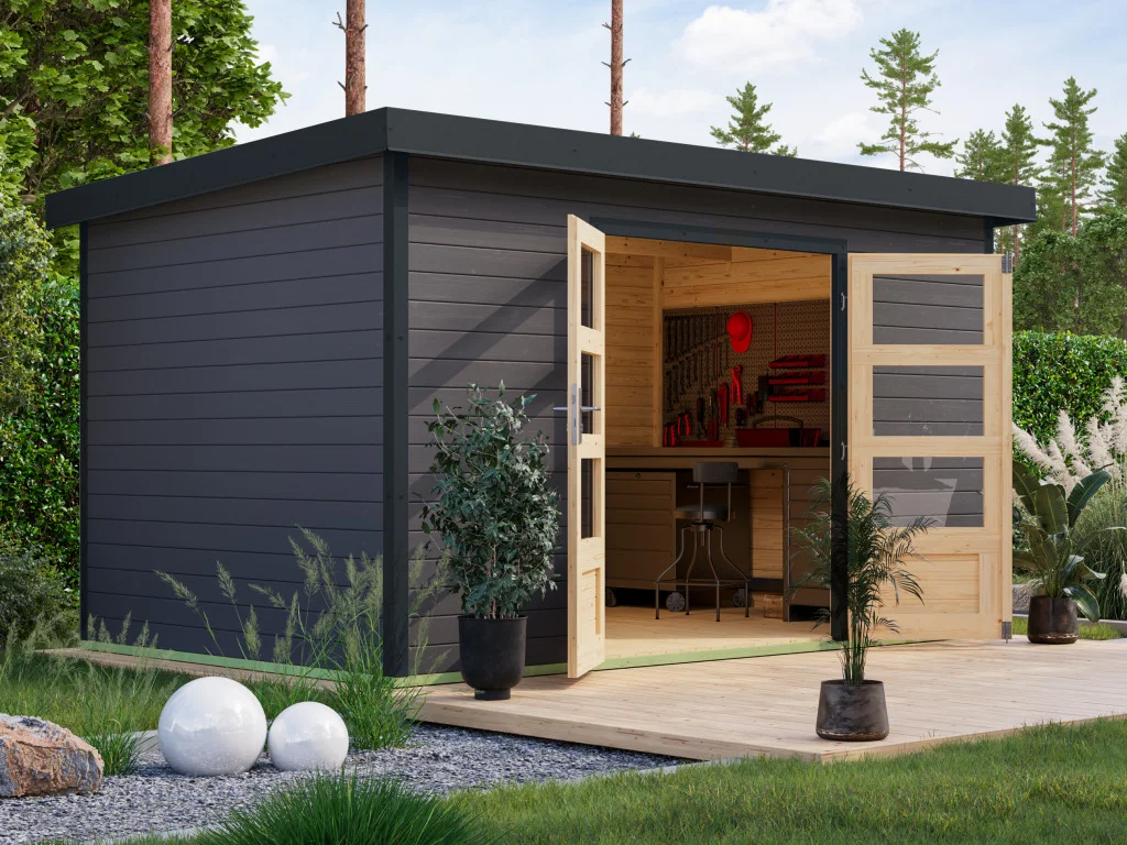 Im Vergleich zu herkömmlichen Holzgartenhäusern sind Hybridhäuser von Karibu erheblich wartungsärmer. Die Stahlecken schützen besonders gut vor Witterung und die Häuser überzeugen durch ihre moderne Optik.