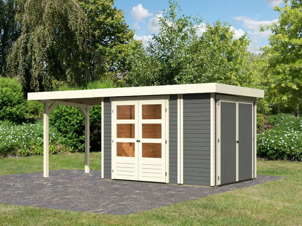 Für besonders viel Stauraum sorgt das Gartenhaus dank Anbauschrank, der mitgeliefert wird. Das Anbaudach und der zusätzliche Anbauschrank eignen sich optimal als Lagerplatz für Gartenmöbel und Gartenutensilien. Durch die Überdachung sind diese stets vor Regen und Sonne geschützt.