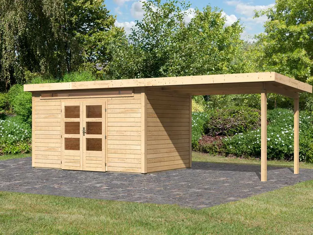 Für mehr Raum und vielfältige Nutzungsmöglichkeiten sorgt dieses Gartenhaus mit Anbaudach. Das großzügig geschnittene Anbaudach ermöglicht es, den Gartenalltag in vollen Zügen im Freien genießen zu können – geschützt vor Sonne, Wind und Regen. Der Platz unter dem Dach kann als gemütliche Terrasse zum Sitzen, Spielen oder Werkeln bei jedem Wetter genutzt werden. Alternativ eignet es sich auch als optimaler Unterstellplatz für zahlreiche Gartengeräte.