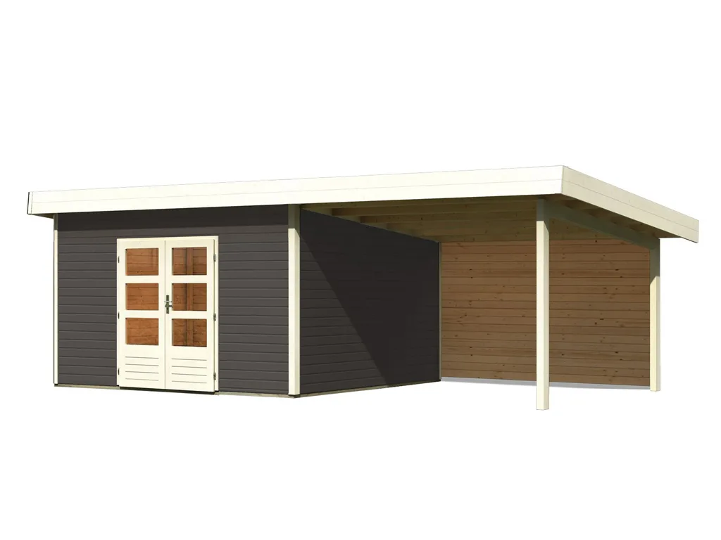 Für mehr Raum und vielfältige Nutzungsmöglichkeiten sorgt dieses Gartenhaus mit Anbaudach. Das großzügig geschnittene Anbaudach ermöglicht es, den Gartenalltag in vollen Zügen im Freien genießen zu können – geschützt vor Sonne, Wind und Regen. Der Platz unter dem Dach kann als gemütliche Terrasse zum Sitzen, Spielen oder Werkeln bei jedem Wetter genutzt werden. Alternativ eignet es sich auch als optimaler Unterstellplatz für zahlreiche Gartengeräte.