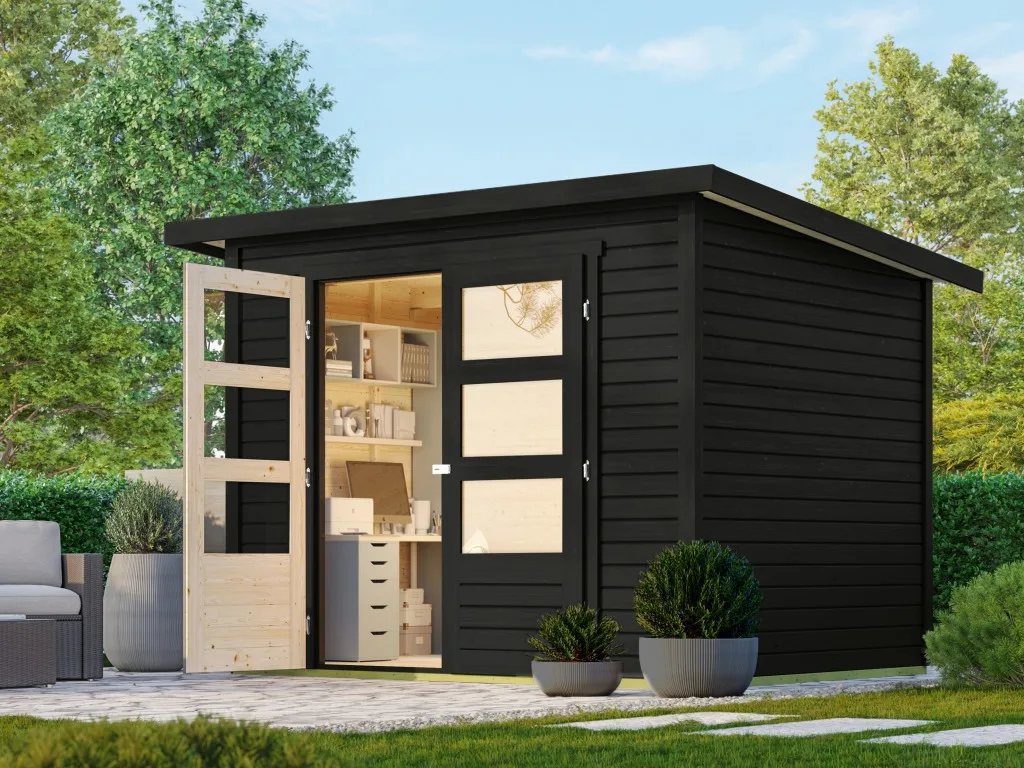 Ein modernes Pultdach verleiht deinem Gartenhaus eine stilvolle, elegante Optik. Durch nur eine geneigte Dachfläche ist die Nutzungsfläche im Inneren des Gartenhauses deutlich weniger eingeschränkt und der Verlust an Nutzraum gering. Zudem lässt die Neigungsseite des Pultdaches das Regenwasser gut abfließen und es ist die Montage von nur einer Regenrinne nötig.