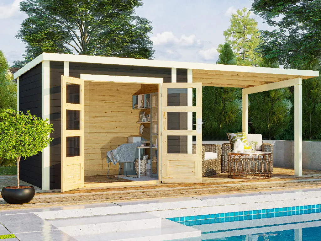 Das Gartenhaus mit Anbaudach ist sehr vielseitig. Der durch das Anbaudach geschaffene zusätzliche Stauraum eignet sich optimal als Lagerplatz für Gartenutensilien oder als Sitzbereich zum gemütlichen Verweilen. Dank Überdachung sind Geräte und Gartenmöbel optimal vor Wind und Wetter geschützt.
