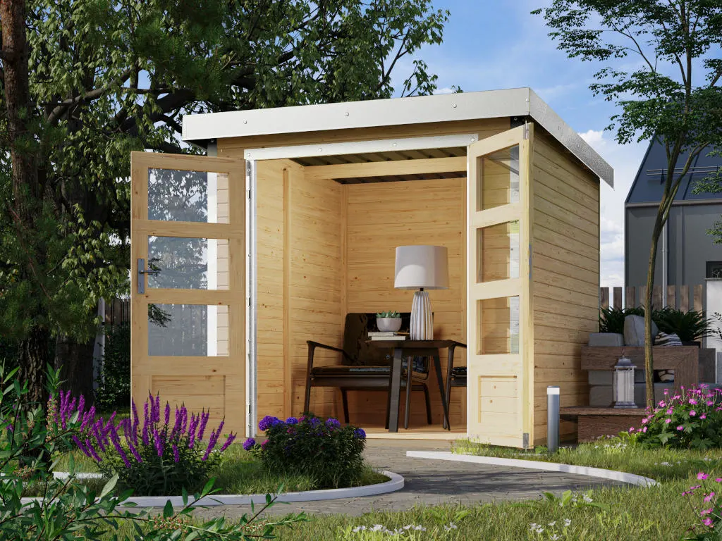Dieses Hybrid-Gartenhaus vereint die Vorteile zweier Rohstoffwelten: Die Wände bestehen aus robustem Holz, an den Ecken und am Dach ist Metall eingesetzt. Das macht das Gartenhaus besonders langlebig, stabil und schützt zudem vor Witterungseinflüssen. Das moderne Design verleiht deinem Garten eine zeitgemäße Optik. Die Kombination aus Holz und Metallelementen ist ein echter Blickfang.