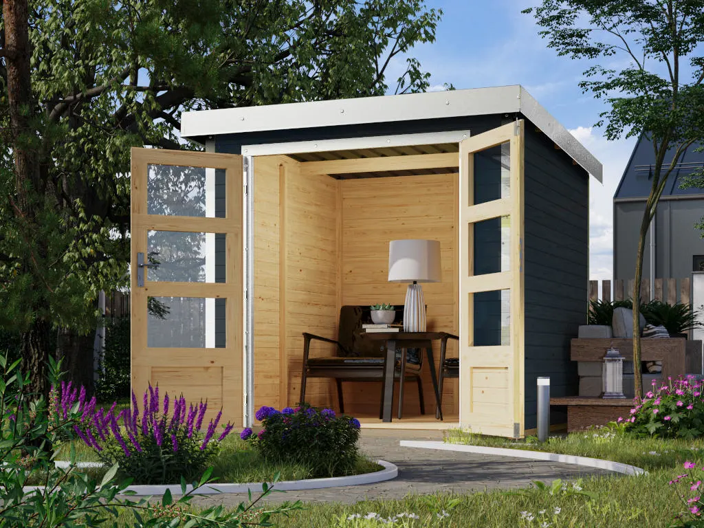 Dieses Hybrid-Gartenhaus vereint die Vorteile zweier Rohstoffwelten: Die Wände bestehen aus robustem Holz, an den Ecken und am Dach ist Metall eingesetzt. Das macht das Gartenhaus besonders langlebig, stabil und schützt zudem vor Witterungseinflüssen. Das moderne Design verleiht deinem Garten eine zeitgemäße Optik. Die Kombination aus Holz und Metallelementen ist ein echter Blickfang.