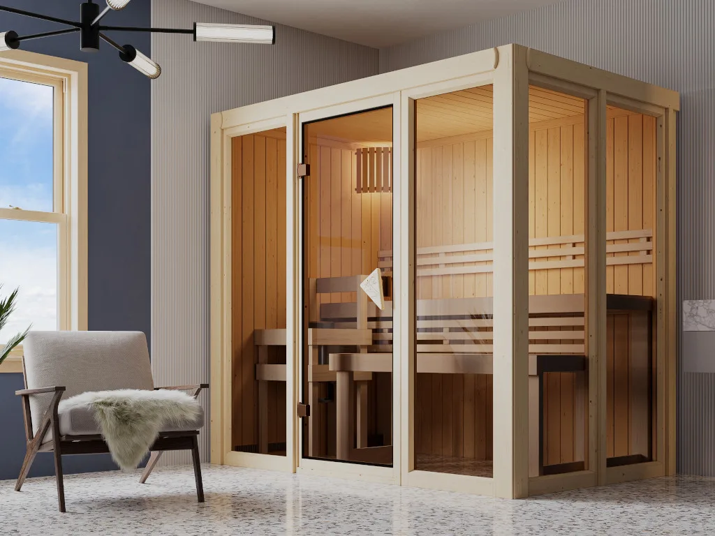 Dieses Saunamodell – eine System- bzw. Elementsauna – zeichnet sich durch seine besondere Sandwich-Bauweise aus, d. h., die Wandelemente bestehen aus einzelnen Schichten. Die bereits vorgefertigten Wandelemente aus Fichte ermöglichen einen schnellen Aufbau innerhalb weniger Stunden. Mit einer Wandstärke von 68 mm sind Systemsaunen optimal isoliert und somit besonders energiesparend. Wegen der sehr gut gedämmten Elemente heizt sich die Systemsauna extra schnell auf.