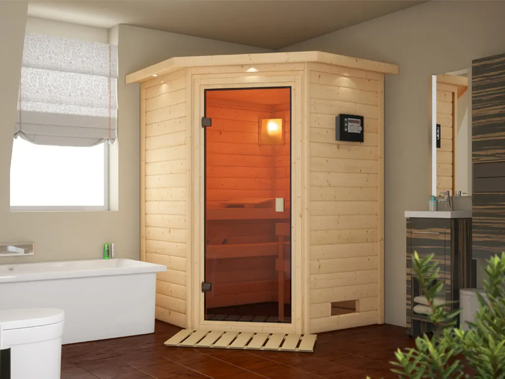 Bei der Montage einer Sauna muss ein Mindestabstand von 10 cm zu Wänden und Decke unbedingt eingehalten werden, um gute Luftzirkulation zu gewährleisten. So kann feucht-warme Luft besser abziehen. In diesem Zusammenhang müssen die Mindestraumhöhe und -breite beachtet werden.