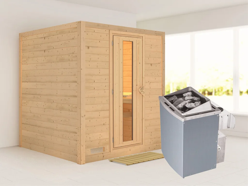 3 Liegen, Ofenschutzgitter aus stabilem Fichtenholz, Kopfstütze aus Espenholz, 9 kW Ofen mit integrierter Steuerung, Bodenrost, Montageanleitung.