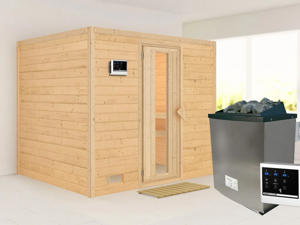 Bei dieser Innensauna ist ein Saunaofen mit einer externen Steuerung inklusive. Das Steuergerät wird außerhalb der Sauna angebracht. Auf diese Weise fängt schon vor dem Saunieren der Komfort an – mit einer bequemen Bedienung von außen und einer noch exakteren Temperatureinstellung. Weitere elektrische Geräte, wie die Kabinenbeleuchtung, können ebenso an die externe Steuerung angeschlossen und bedient werden.