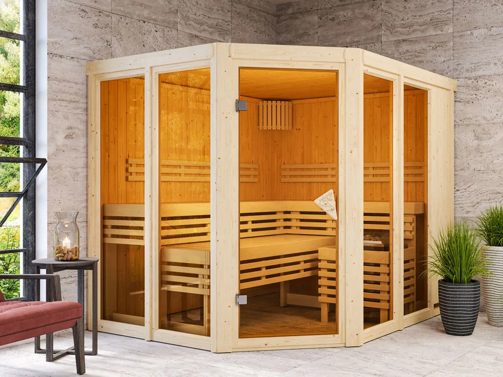 Dieses Saunamodell – eine System- bzw. Elementsauna – zeichnet sich durch seine besondere Sandwich-Bauweise aus, d.h. die Wandelemente bestehen aus einzelnen Schichten. Die bereits vorgefertigten Wandelemente ermöglichen einen schnellen Aufbau innerhalb weniger Stunden.