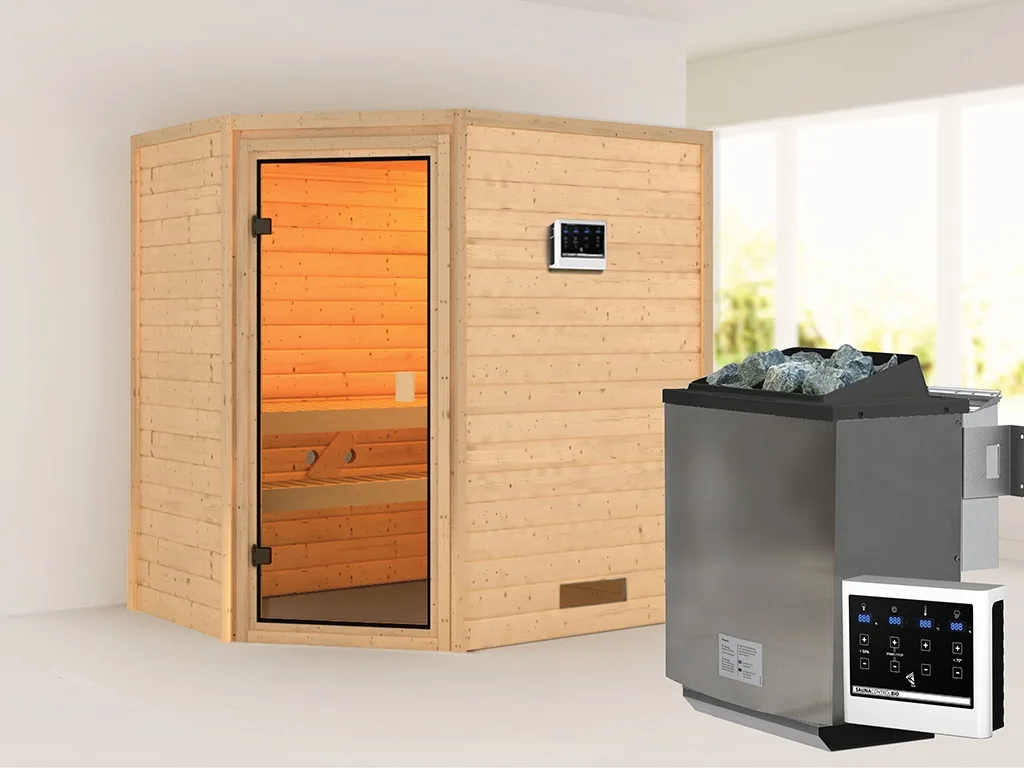 Sauna Massivholzsauna Jella, inkl. 9 kW Bio-Ofen mit externer Steuerung