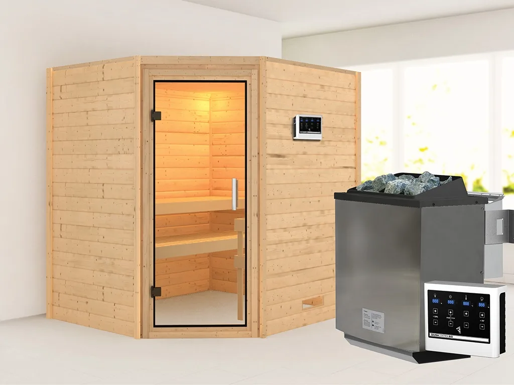 Sauna Massivholzsauna Mia, inkl. 9 kW Bio-Ofen mit externer Steuerung
