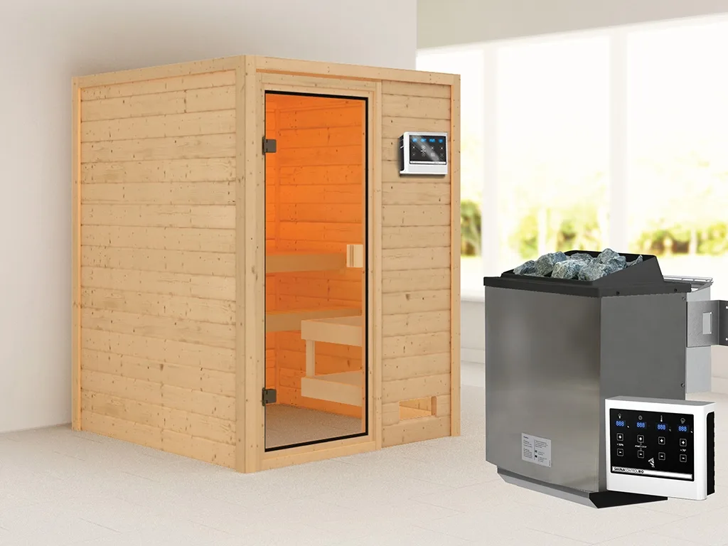 Sauna Massivholzsauna Sandra, inkl. 9 kW Bio-Ofen mit externer Steuerung
