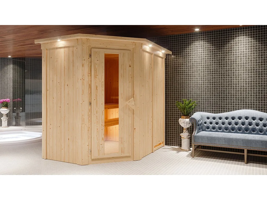 Sauna Systemsauna Carin mit Dachkranz, inkl. 9 kW Ofen mit integrierter Steuerung