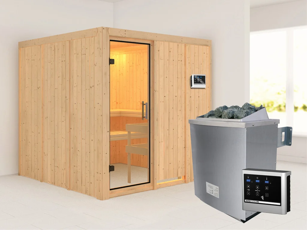 Bei dieser Innensauna ist ein Saunaofen mit einer externen Steuerung inklusive. Das Steuergerät wird außerhalb der Sauna angebracht. Auf diese Weise fängt schon vor dem Saunieren der Komfort an – mit einer bequemen Bedienung von außen und einer noch exakteren Temperatureinstellung. Weitere elektrische Geräte, wie die Kabinenbeleuchtung, können ebenso an die externe Steuerung angeschlossen und bedient werden.