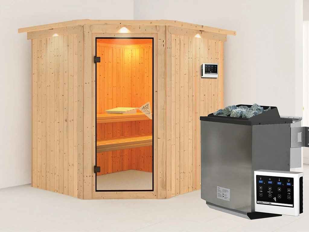 Sauna Systemsauna Siirin mit Dachkranz, inkl. 9 kW Bio-Ofen mit externer Steuerung