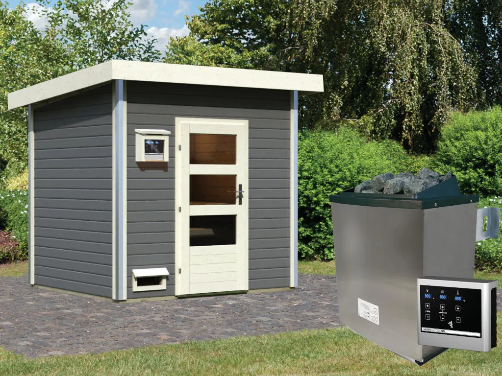 Diese Innensauna wird mit Saunaofen und einer externen Steuerung geliefert. Die Anbringung des Steuergerätes erfolgt an der Außenseite der Sauna. Ganz komfortabel kann somit die Saunasteuerung von außen erledigt und die Temperatur exakt bestimmt werden. Zusätzlich verfügt das Steuergerät über eine Anschlussstelle, über die ein weiteres elektrisches Gerät bedient werden kann.