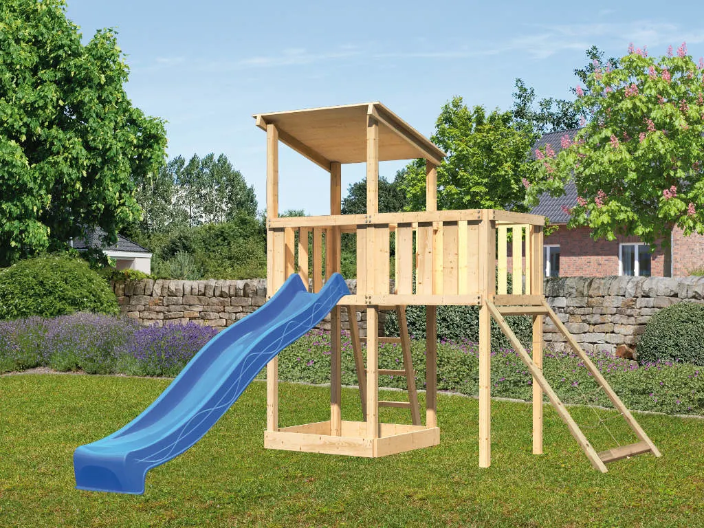 • Der Spielturm hat 68 mm x 68 mm starke Massivholzpfosten, welche Auflage für das Pultdach bieten.