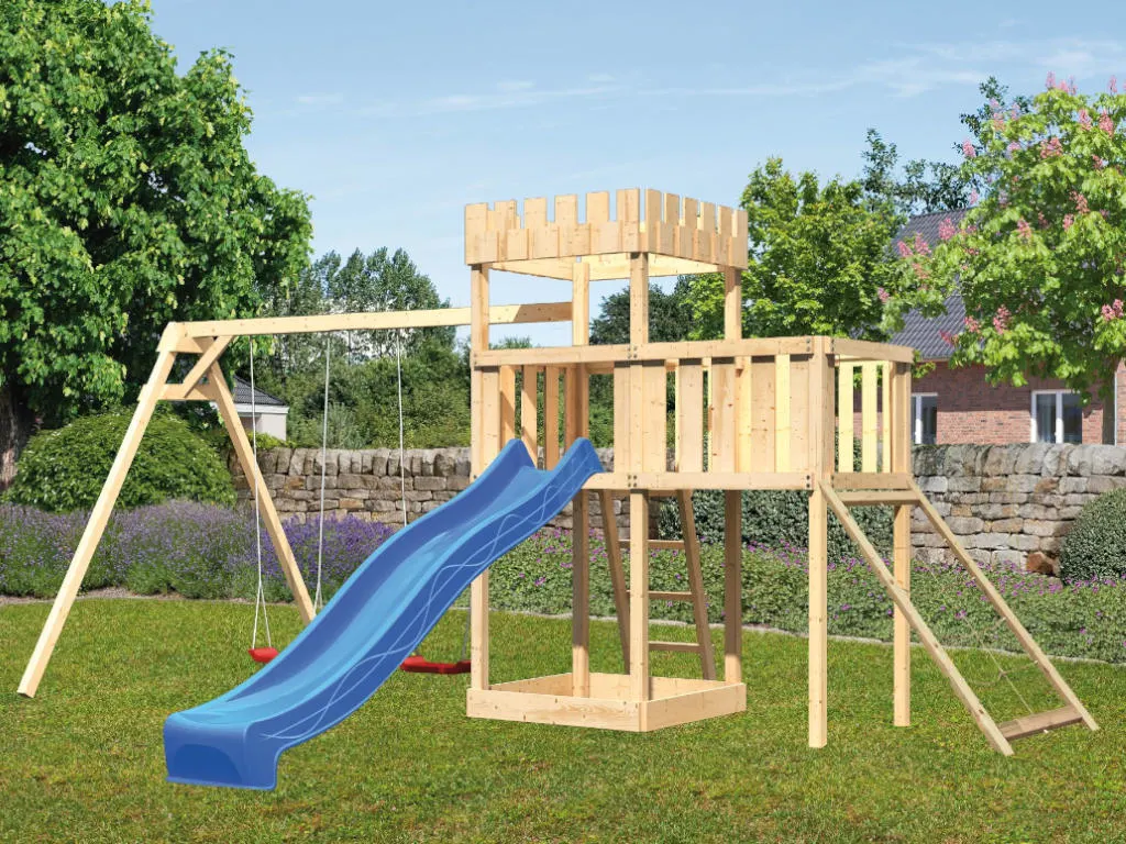 Material: Holz, BxTxH: 107x107x259,5 cm, inkl. Doppelschaukelanbau, Anbauplattform, Netzrampe, Rutsche blau