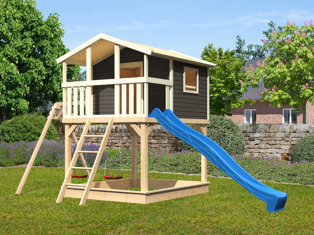 Nicht für Kinder unter 3 Jahren geeignet. Geeignet für Kinder von 3 bis 14 Jahren. Benutzung nur unter unmittelbarer Aufsicht von Erwachsenen. Stolper- und/oder Sturzgefahr. Nur für den häuslichen, privaten Bereich (DIN EN 71-8). Ausschließlich für die Verwendung im Freien. Spieltürme/Stelzenhäuser mit einer Spielhöhe von über 60 cm müssen auf einer weichen Unterlage wie Gras oder Holzspänen aufgestellt werden. Bei Spieltürmen/Stelzenhäusern mit einer Spielhöhe unter 60 cm wird eine weiche Unterlage ebenfalls empfohlen. Die Grundkonstruktion ist in regelmäßigen Abständen auf etwaige Beschädigung und Fäulnisbefall zu kontrollieren. Um die Stabilität zu gewährleisten, müssen die Pfosten im Boden verankert werden. Die Schraubverbindungen sind in regelmäßigen Abständen (ca. 4 Wochen, je nach Benutzungshäufigkeit und Alter des Spielgerätes) auf festen Sitz und Stabilität zu überprüfen. Die angegebenen Maße können geringfügig abweichen.