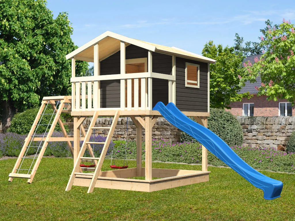 Nicht für Kinder unter 3 Jahren geeignet. Geeignet für Kinder von 3 bis 14 Jahren. Benutzung nur unter unmittelbarer Aufsicht von Erwachsenen. Stolper- und/oder Sturzgefahr. Nur für den häuslichen, privaten Bereich (DIN EN 71-8). Ausschließlich für die Verwendung im Freien. Spieltürme/Stelzenhäuser mit einer Spielhöhe von über 60 cm müssen auf einer weichen Unterlage wie Gras oder Holzspänen aufgestellt werden. Bei Spieltürmen/Stelzenhäusern mit einer Spielhöhe unter 60 cm wird eine weiche Unterlage ebenfalls empfohlen. Die Grundkonstruktion ist in regelmäßigen Abständen auf etwaige Beschädigung und Fäulnisbefall zu kontrollieren. Um die Stabilität zu gewährleisten, müssen die Pfosten im Boden verankert werden. Die Schraubverbindungen sind in regelmäßigen Abständen (ca. 4 Wochen, je nach Benutzungshäufigkeit und Alter des Spielgerätes) auf festen Sitz und Stabilität zu überprüfen. Die angegebenen Maße können geringfügig abweichen.