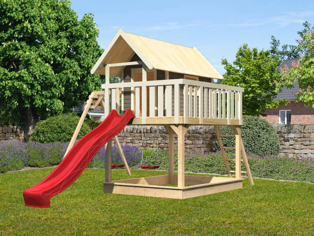 Nicht für Kinder unter 3 Jahren geeignet. Geeignet für Kinder von 3 bis 14 Jahren. Benutzung nur unter unmittelbarer Aufsicht von Erwachsenen. Stolper- und/oder Sturzgefahr. Nur für den häuslichen, privaten Bereich (DIN EN 71-8). Ausschließlich für die Verwendung im Freien. Spieltürme/Stelzenhäuser mit einer Spielhöhe von über 60 cm müssen auf einer weichen Unterlage wie Gras oder Holzspänen aufgestellt werden. Bei Spieltürmen/Stelzenhäusern mit einer Spielhöhe unter 60 cm wird eine weiche Unterlage ebenfalls empfohlen. Die Grundkonstruktion ist in regelmäßigen Abständen auf etwaige Beschädigung und Fäulnisbefall zu kontrollieren. Um die Stabilität zu gewährleisten, müssen die Pfosten im Boden verankert werden. Die Schraubverbindungen sind in regelmäßigen Abständen (ca. 4 Wochen, je nach Benutzungshäufigkeit und Alter des Spielgerätes) auf festen Sitz und Stabilität zu überprüfen. Die angegebenen Maße können geringfügig abweichen.