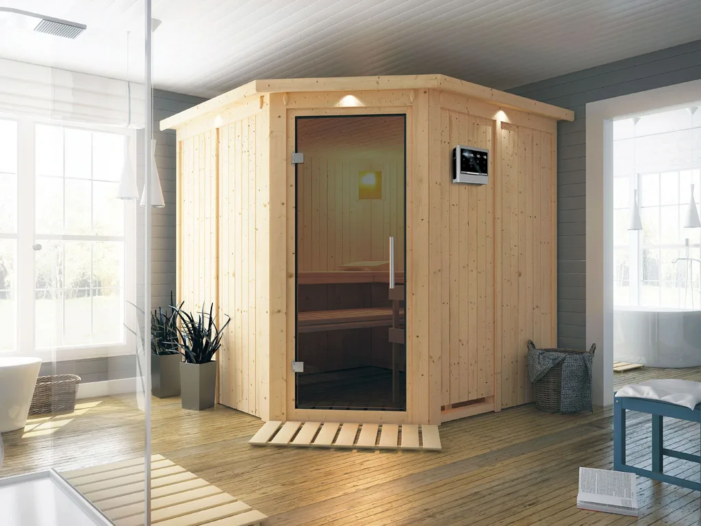 3 Liegen, Ofenschutzgitter aus stabilem Fichtenholz, Kopfstütze aus Espenholz, 9 kW Bio-Kombiofen mit externer Steuerung, Dachkranz inkl. 3 LED-Strahlern á 7, 5 Watt, Montageanleitung.