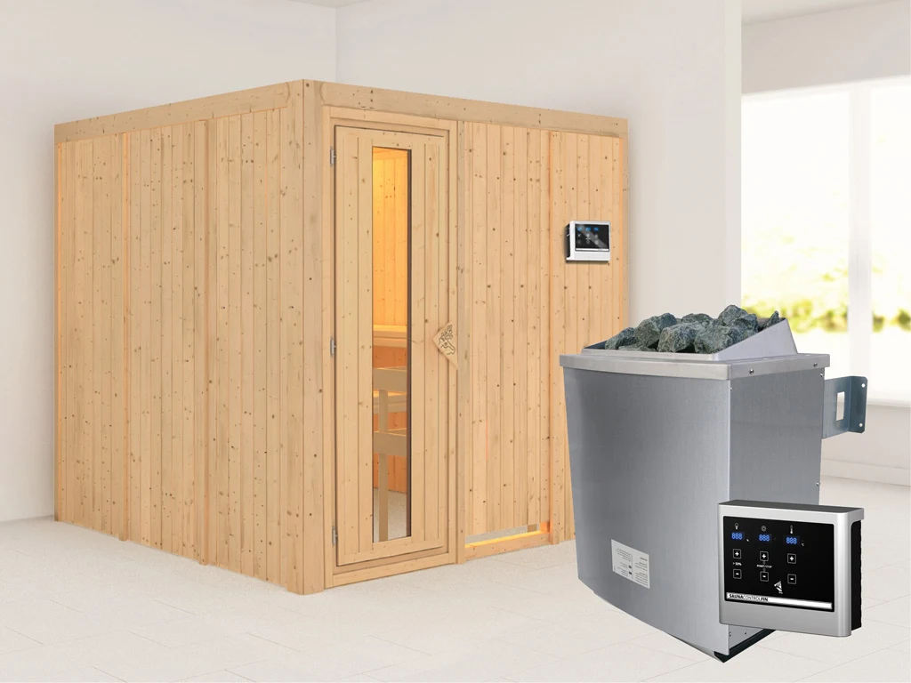 Bei dieser Innensauna ist ein Saunaofen mit einer externen Steuerung inklusive. Das Steuergerät wird außerhalb der Sauna angebracht. Auf diese Weise fängt schon vor dem Saunieren der Komfort an – mit einer bequemen Bedienung von außen und einer noch exakteren Temperatureinstellung. Weitere elektrische Geräte, wie die Kabinenbeleuchtung, können ebenso an die externe Steuerung angeschlossen und bedient werden.