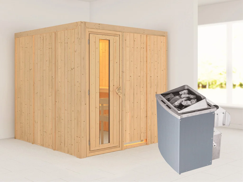 3 Liegen, 9 kW Saunaofen, int. Steuerung, 1 Kopfstütze aus Espenholz, Ofenschutzgitter aus stabilem Fichtenholz. Montageanleitung.