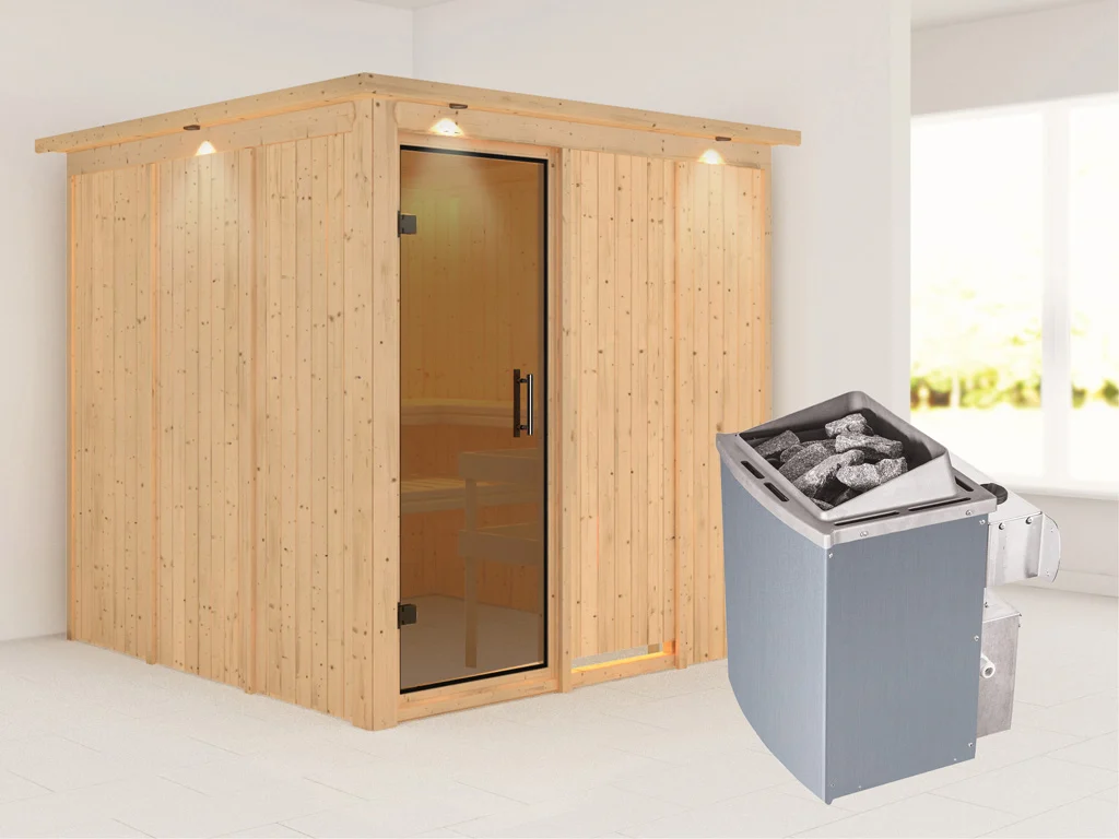 3 Liegen, 9 kW Saunaofen, int. Steuerung, 1 Kopfstütze aus Espenholz, Ofenschutzgitter aus stabilem Fichtenholz, Dachkranz inkl. 3 LED-Strahlern á 7, 5 Watt, Montageanleitung.