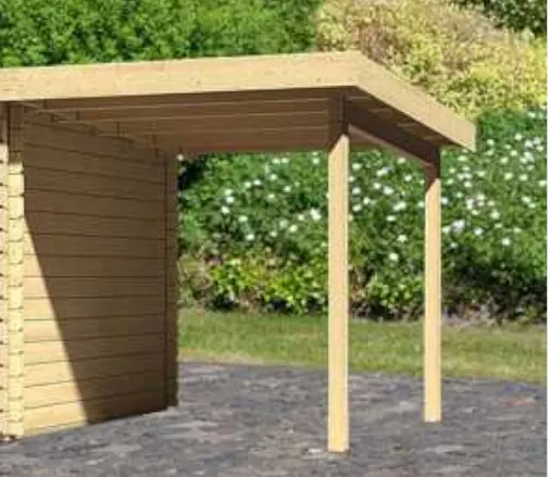 Der Anbau verfügt über eine sehr robuste Bauweise, gepaart mit einer besonderen und natürlichen Ästhetik. Die Bohlenbauweise wird fortgeführt. Der Anbau schließt an einer Seite perfekt an das Gartenhaus an, auf der anderen Seiten sorgen zwei stabile Pfosten für Standfestigkeit.