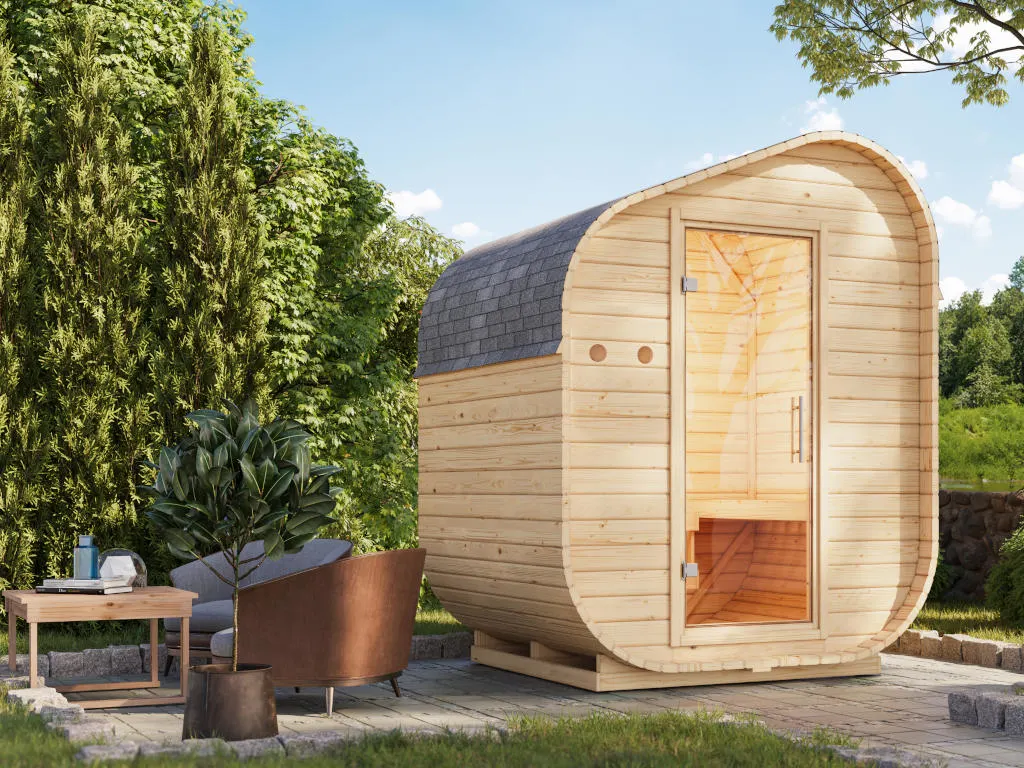 Fasssaunen ziehen mit ihrer außergewöhnlichen Optik nicht nur alle Blicke auf sich, sondern bieten auch hervorragende technische Eigenschaften. Die runde Form ermöglicht eine optimale Luft- und Wärmezirkulation sowie ein besonders schnelles, sparsames Erhitzen ohne unangenehmen Hitzestau in den Ecken und unter der Decke. Dank ihrer kompakten Form und geringen Grundfläche sind Fasssaunen besonders gut für kleine Gärten geeignet.