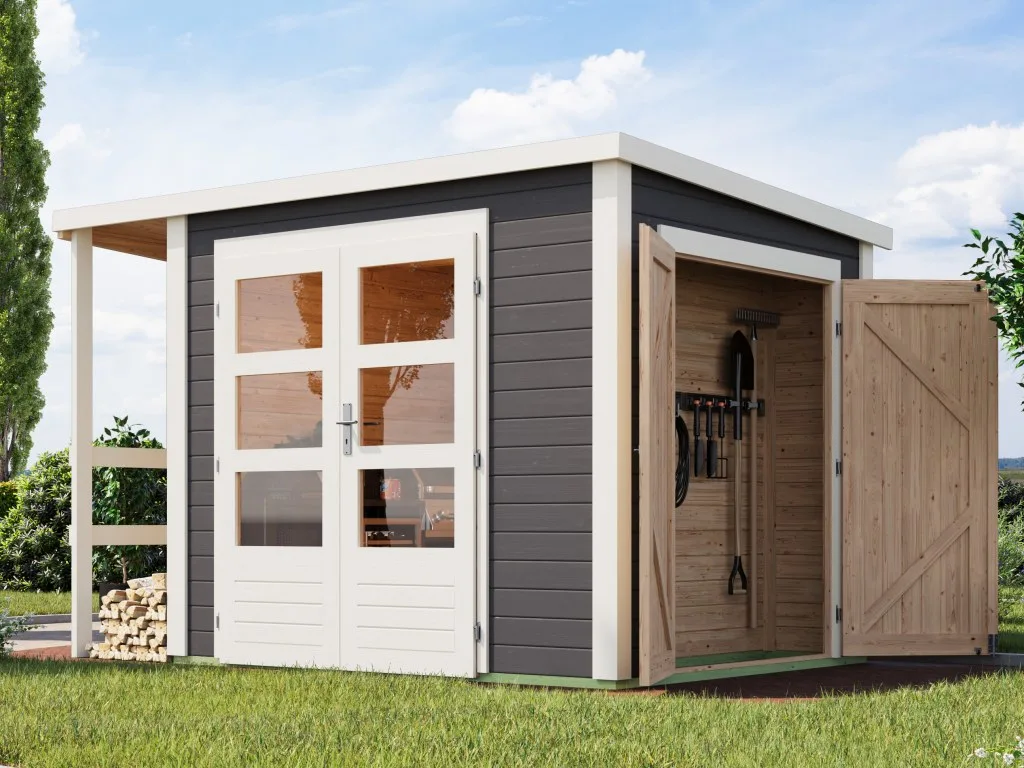 Ein modernes Pultdach verleiht deinem Gartenhaus eine stilvolle, elegante Optik. Durch nur eine geneigte Dachfläche ist die Nutzungsfläche im Inneren des Gartenhauses deutlich weniger eingeschränkt und der Verlust an Nutzraum gering. Zudem lässt die Neigungsseite des Pultdaches das Regenwasser gut abfließen und es ist die Montage von nur einer Regenrinne nötig.